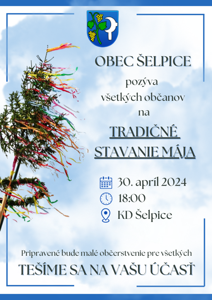 Obec Šelpice Vás pozýva na každoročné tradičné stavanie mája, ktoré sa bude konať 30. apríla 2024 (utorok) o 18:00 pri Kultúrnom dome.